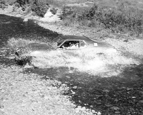 We decided to publicize the rally as a truly challenging event. During the initial route setup we took a number of photos of the proposed route and the countryside. Our aim was to promote the ruggedness of the country and the challenge of the mountain roads. I don't think we mentioned that there were no speed limits. As I recall, we sort of kept this a secret. My motorsport team, Team Sutul, was sponsored by Hertz at the time (in fact, Bob Leonard and Jack Bendle won the 1973 Alberta Rally Champoinship in our Hertz automatic transmission Mustangs). Hertz gave us a brand new, never been rented, AMC Javelin to set up the route. Rob Keith and I set out to explore the roads.
